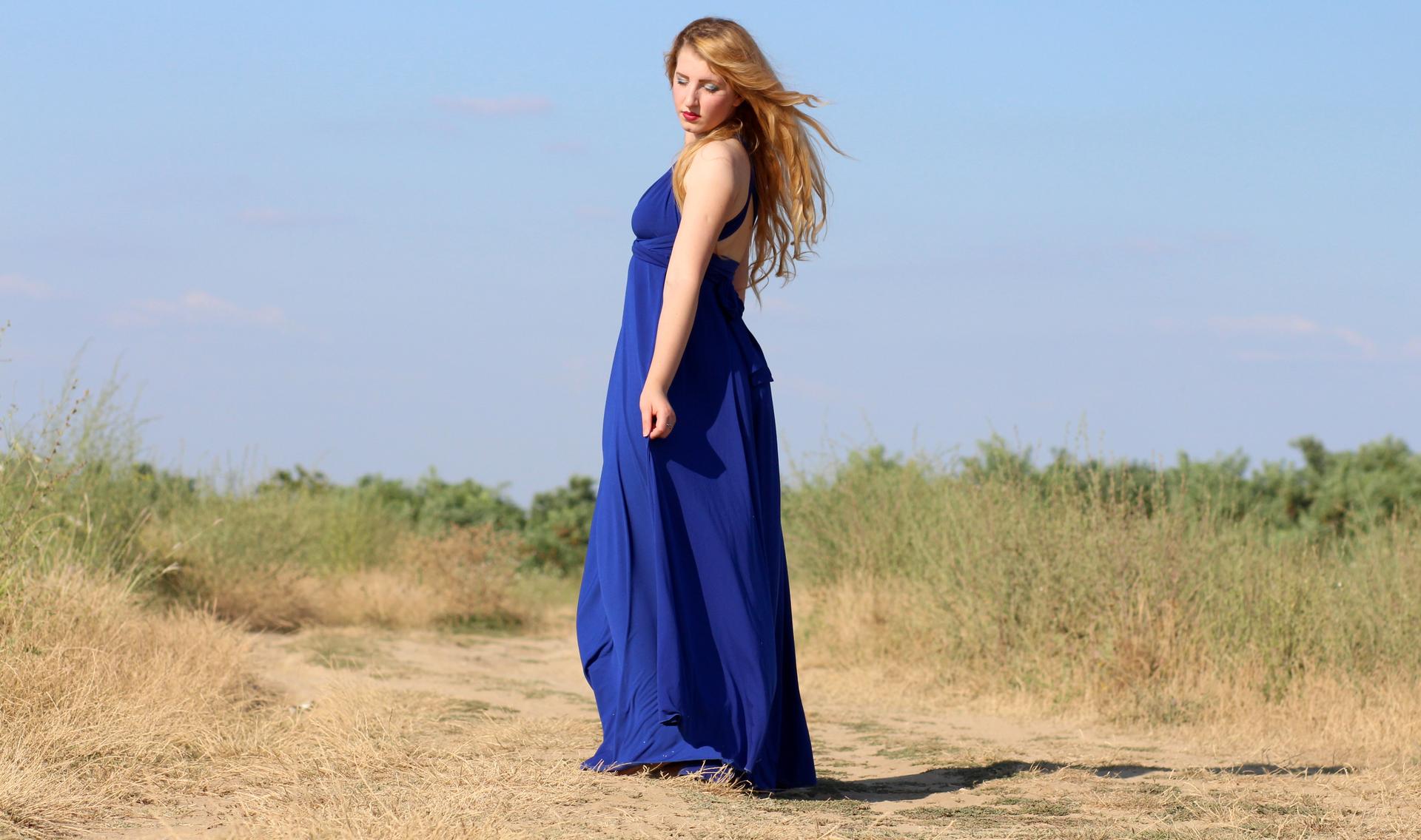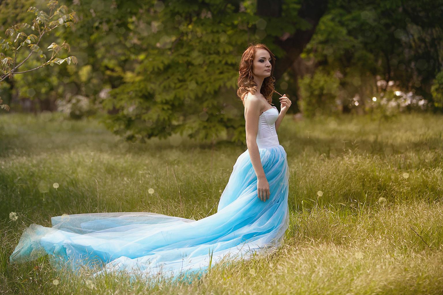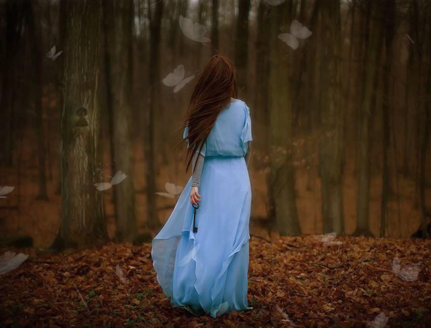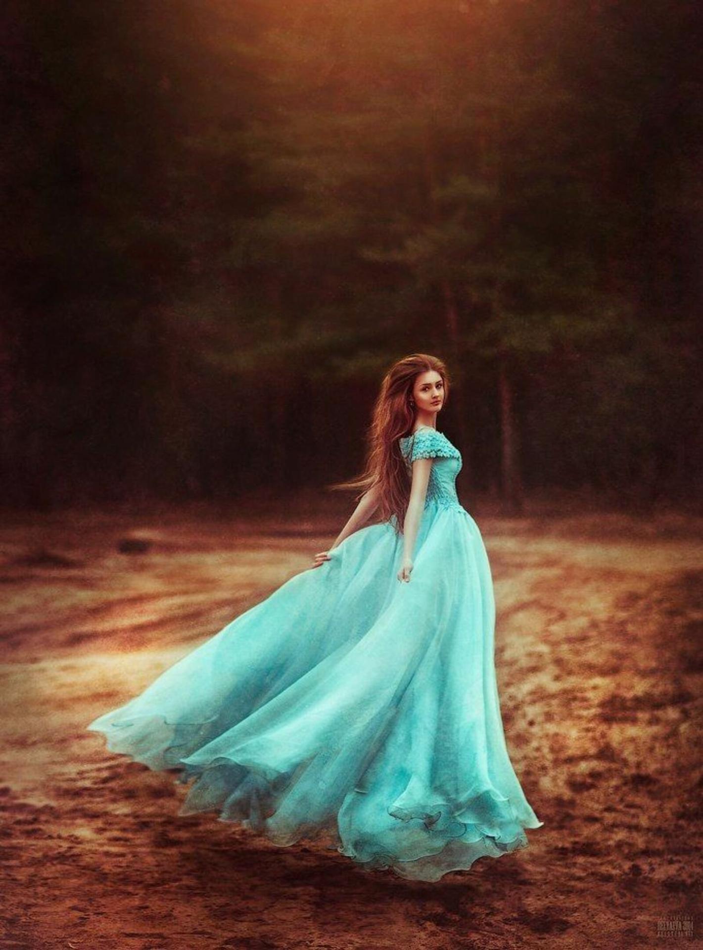 Девушки с длинными волосами в голубых платьях