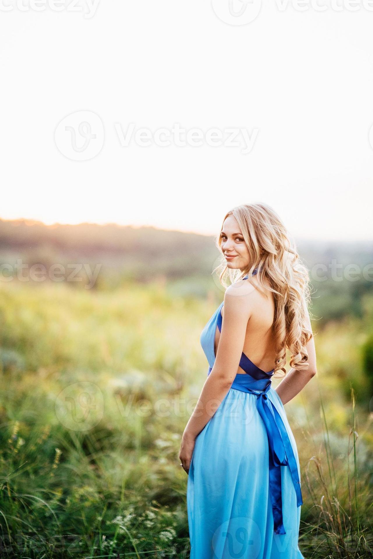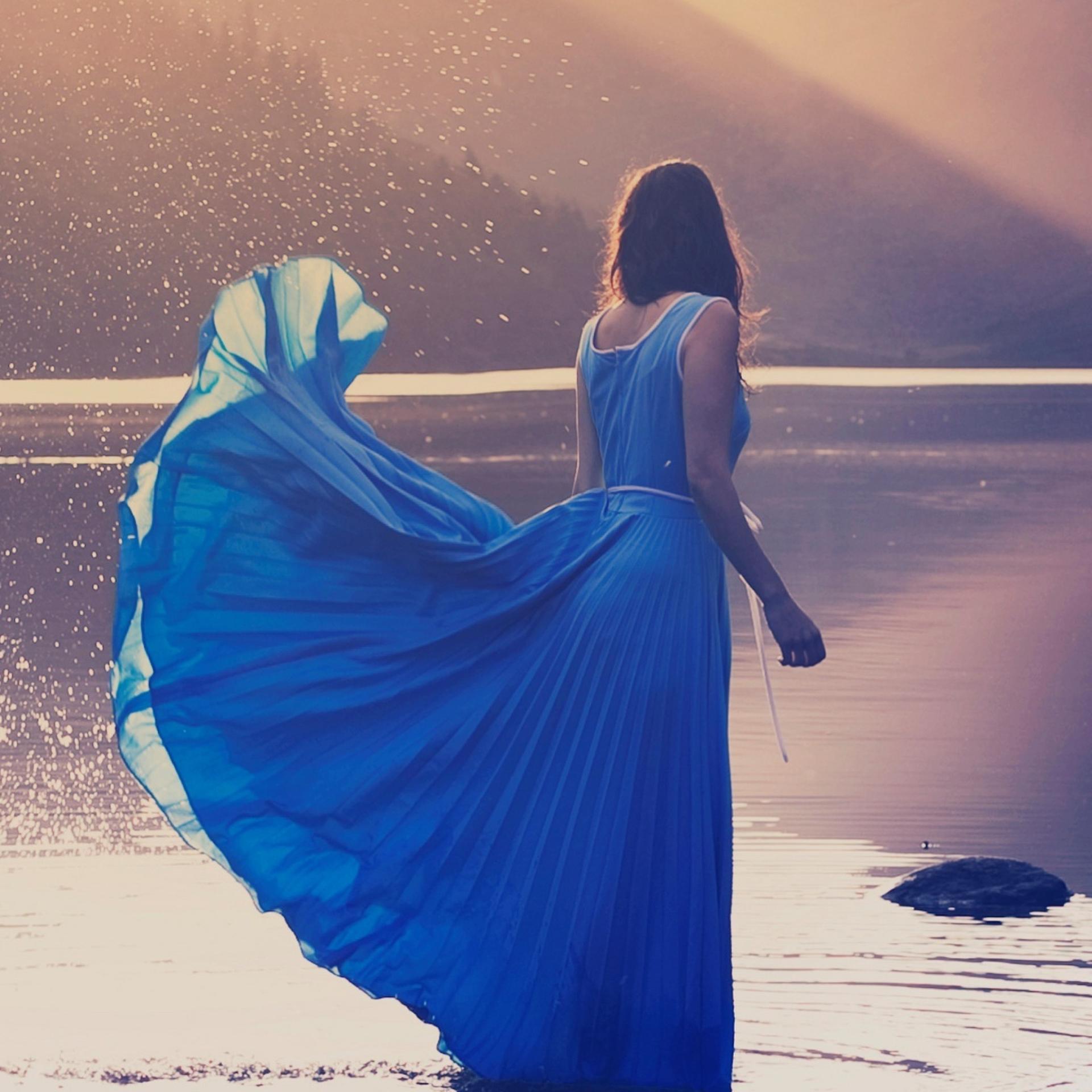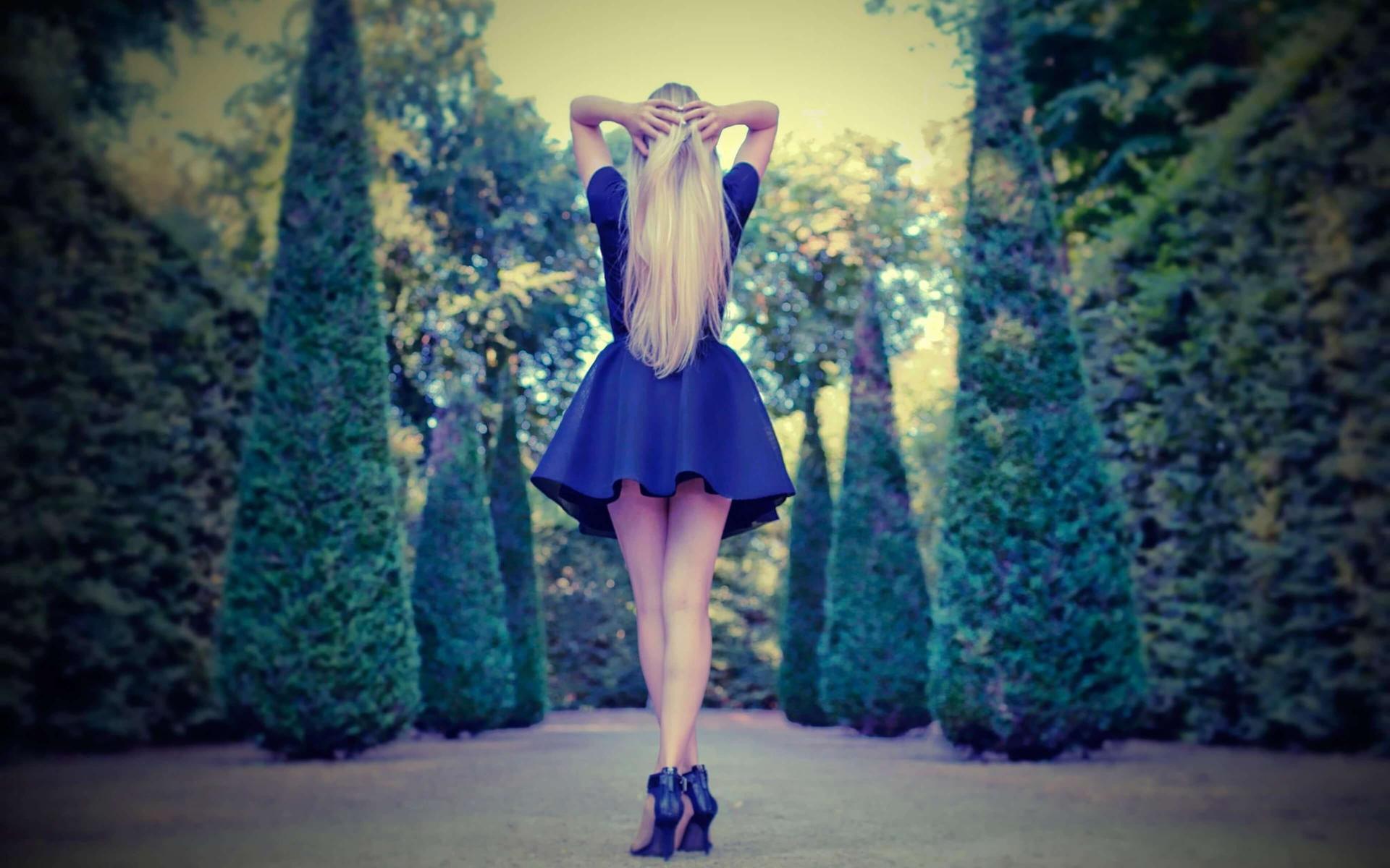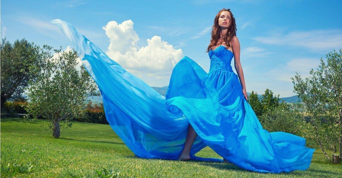Девушки с длинными волосами в голубых платьях