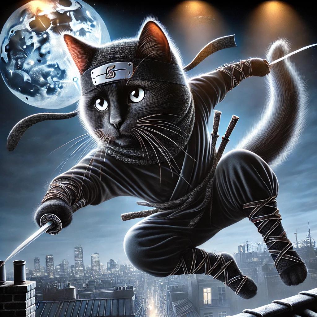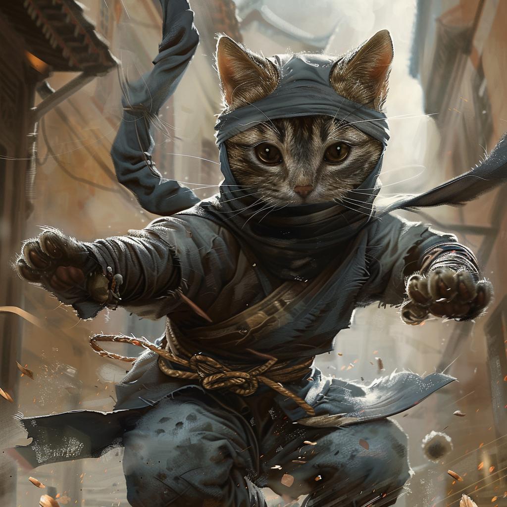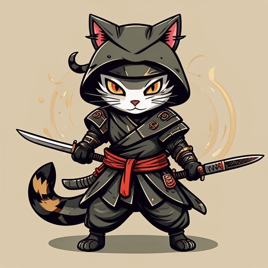 Представьте себе ниндзя, которые вместо того, чтобы скрываться в тени, оставляют за собой след из шерсти и мяукают во время миссий. Эти кошачьи воины на иллюстрации сочетают грацию хищников с непосредственностью домашних любимцев. Художник передал атмосферу ночных приключений, где серьезные боевые искусства смешиваются с кошачьим любопытством и игривостью. Композиция показывает, что даже в самых серьезных ситуациях можно найти повод для улыбки.