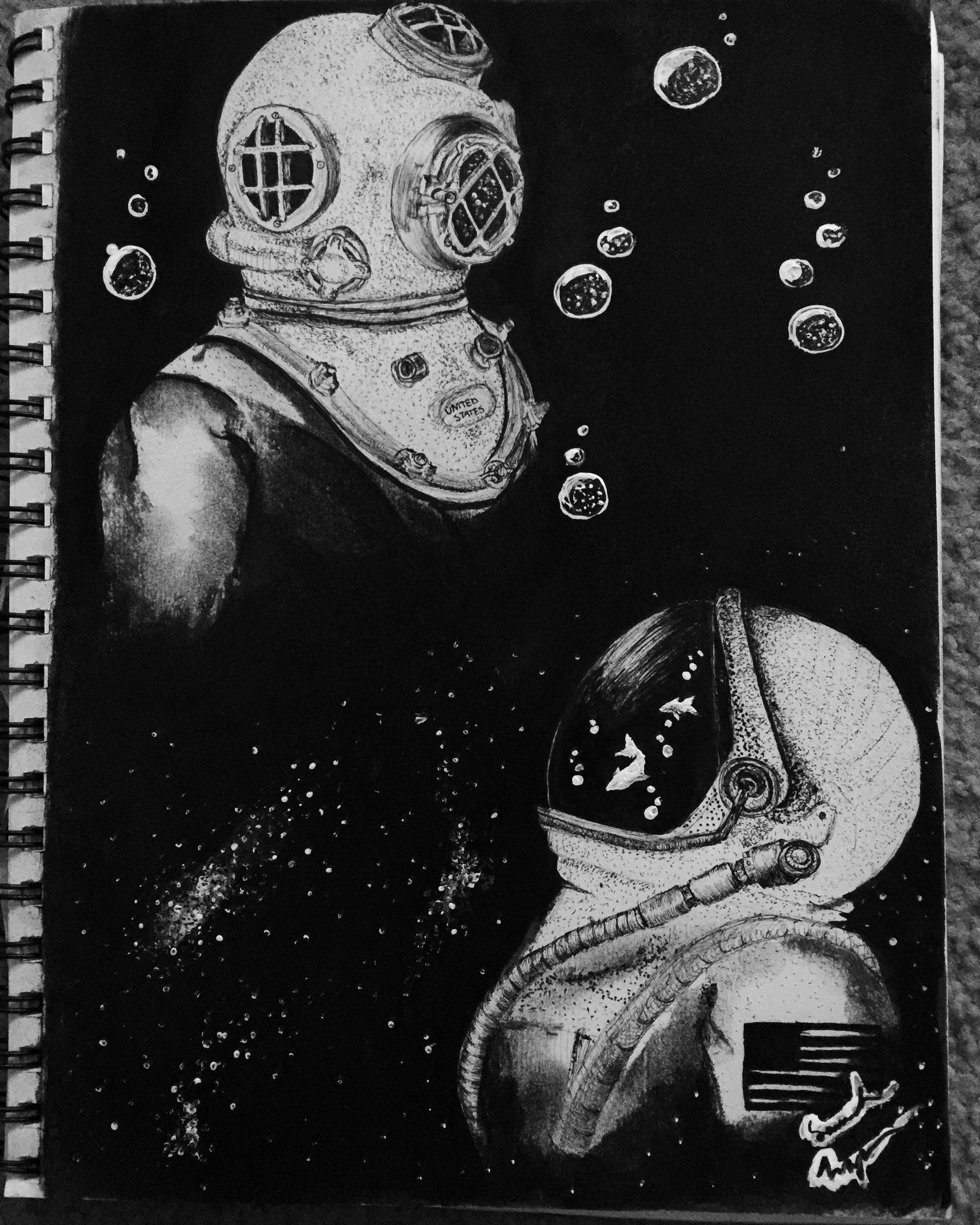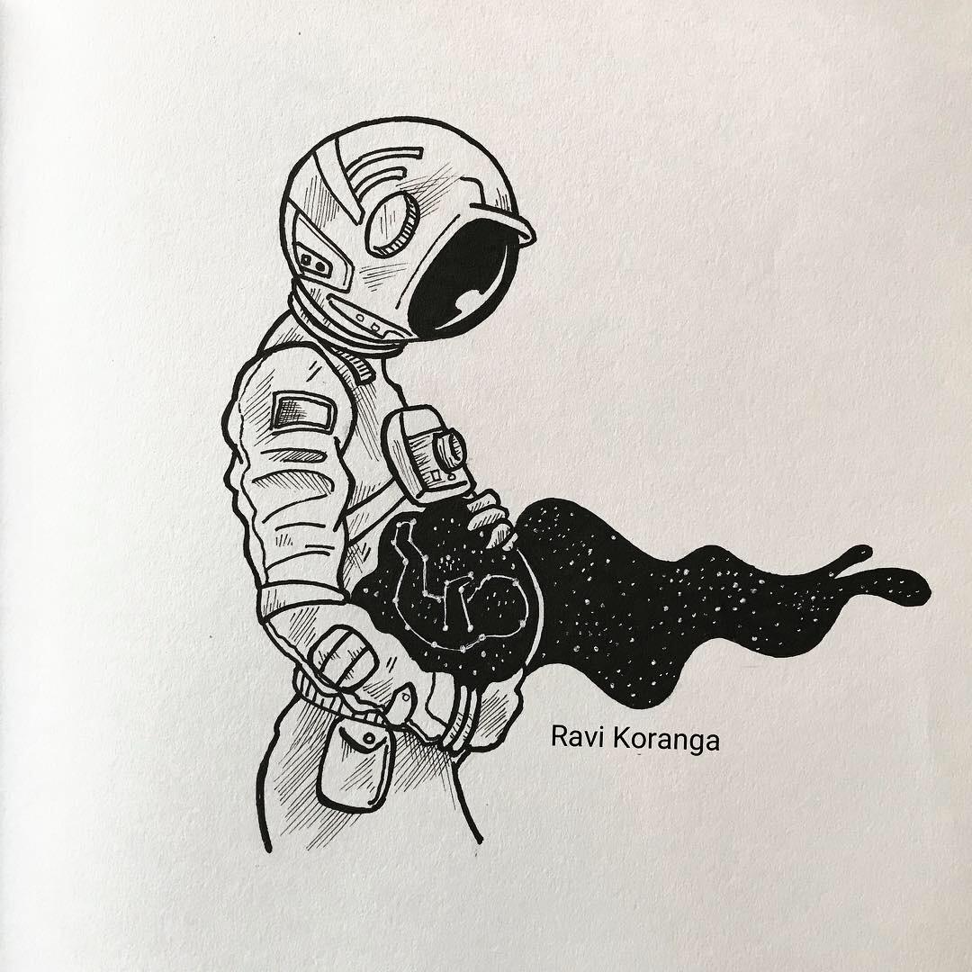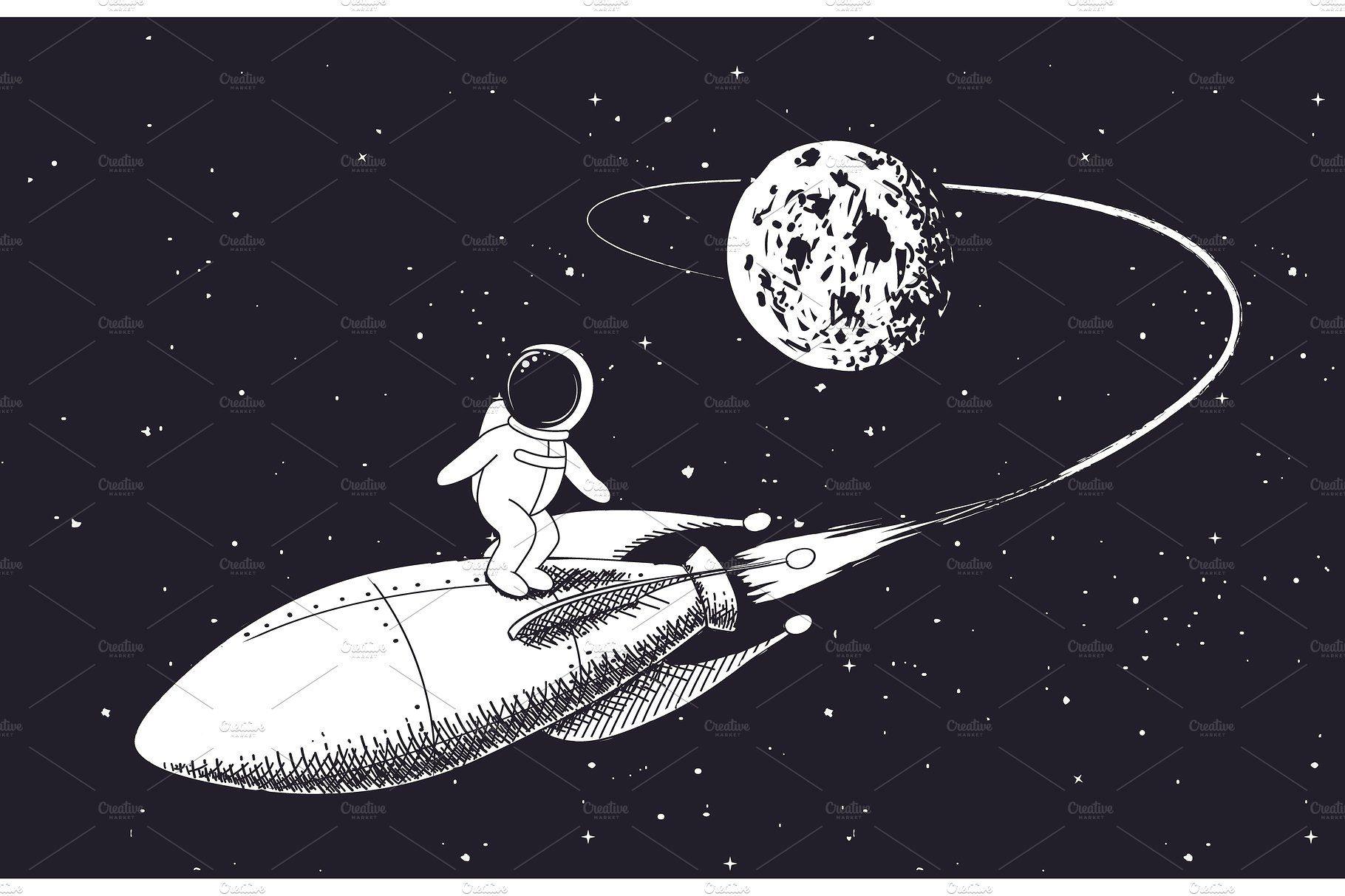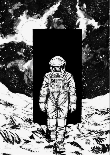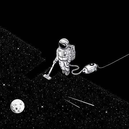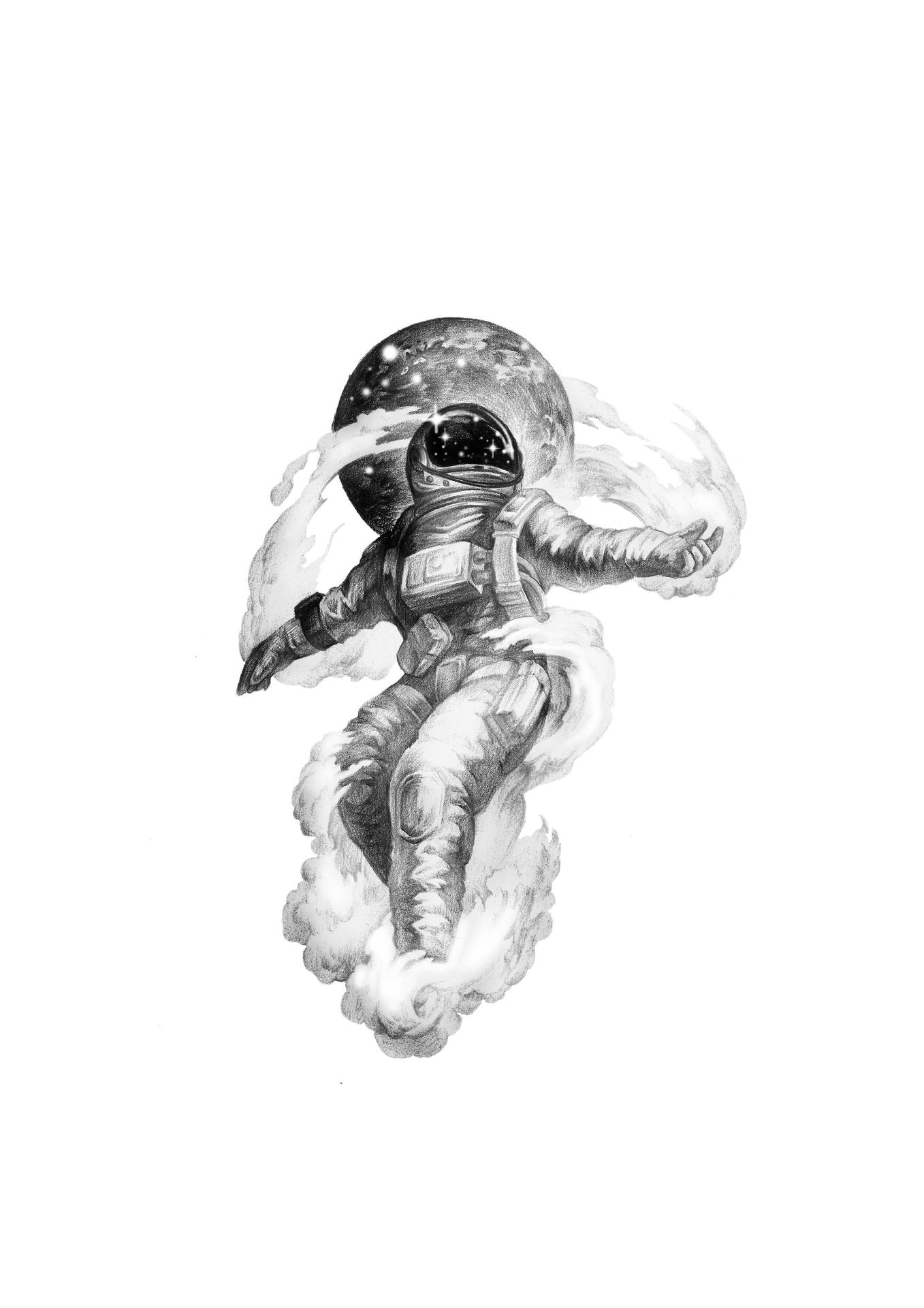 В черно-белой стилистике эта иллюстрация передает атмосферу героической эпохи освоения космоса, когда каждый полет был настоящим подвигом. Космонавт предстает как настоящий первопроходец, чье лицо выражает смесь сосредоточенности и восторга. Художник акцентировал внимание на деталях скафандра и выражении глаз, которые говорят о величии момента. Композиция напоминает о том, что человеческий дух способен преодолевать любые границы и барьеры.